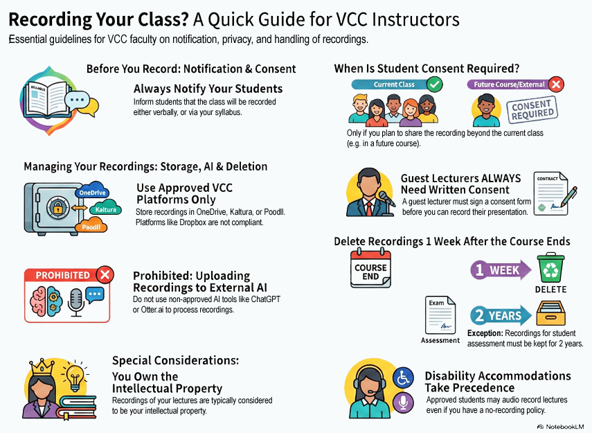 The following document and infographic describe VCC’s guidelines and policies around classroom recordings for instructors and students: